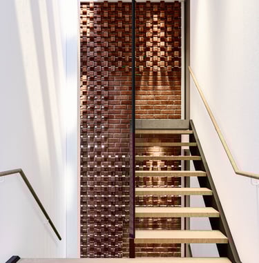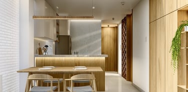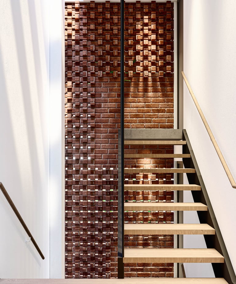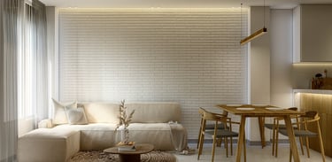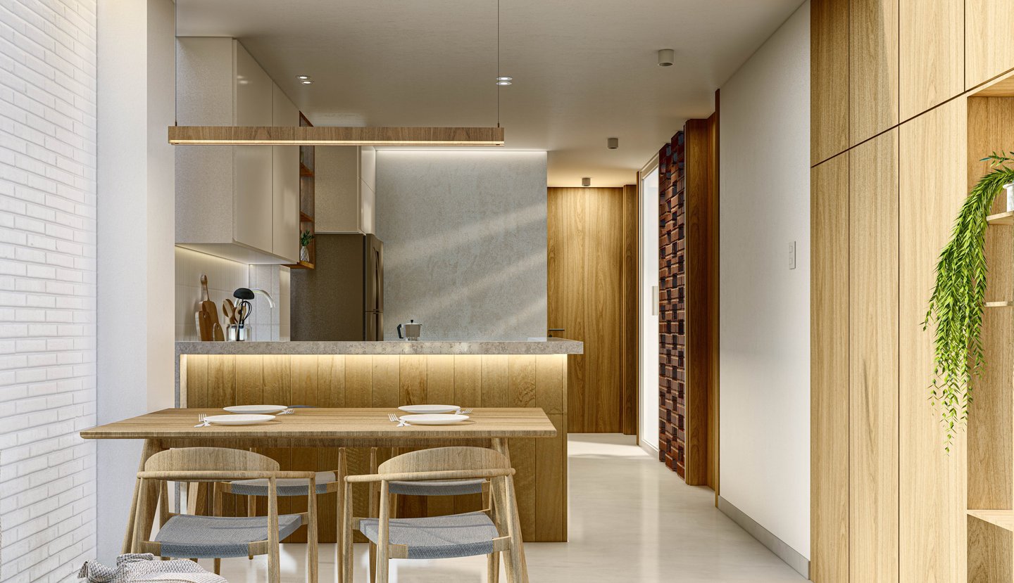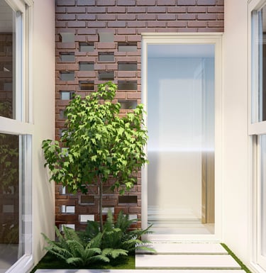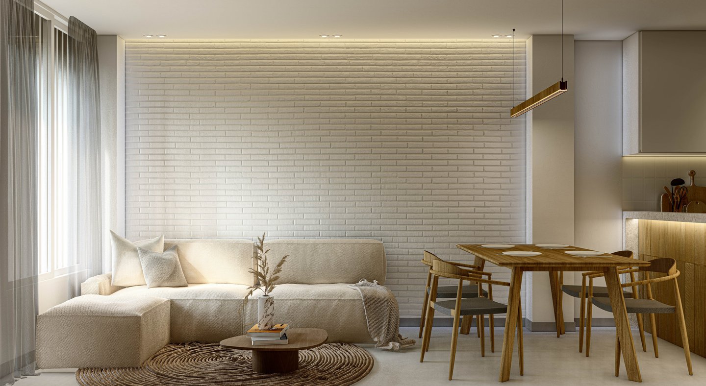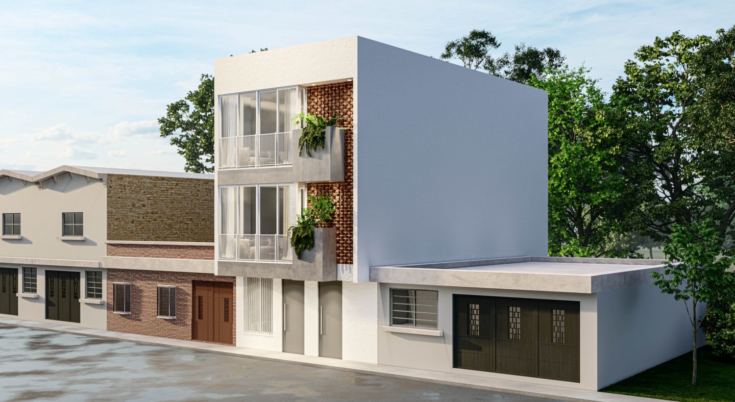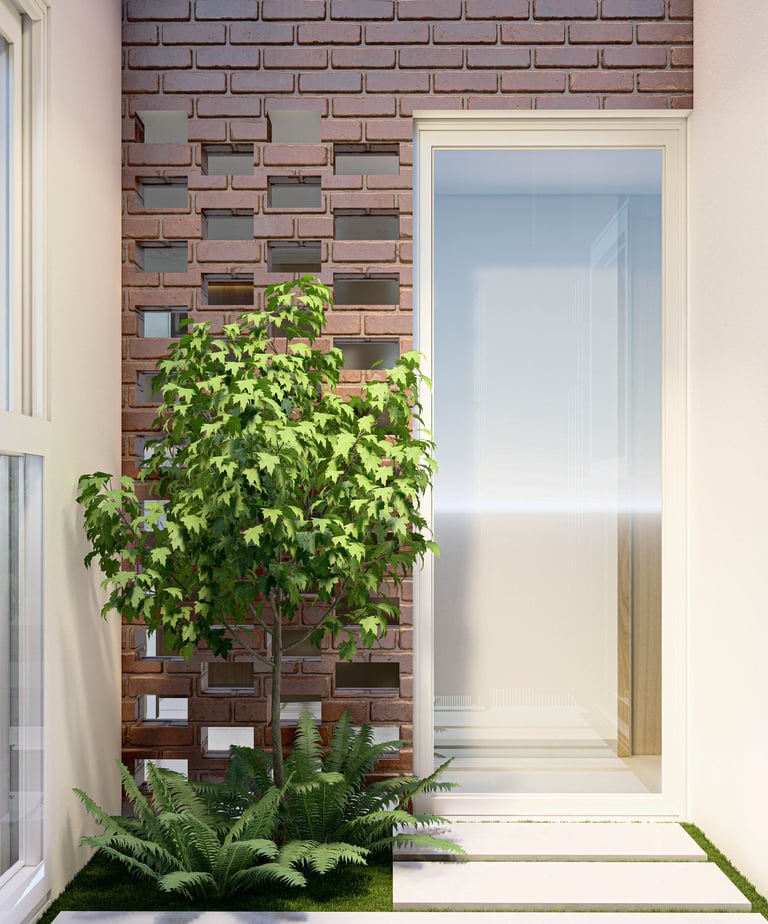 Una vivienda pensada con materiales comunes como el ladrillo y el concreto pulido, destacando sus cualidades estéticas naturales. La integración de la vegetación en espacios interiores y exteriores crea un ambiente que fusiona la rusticidad de los materiales con la frescura de la naturaleza.