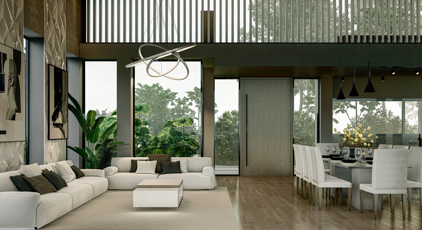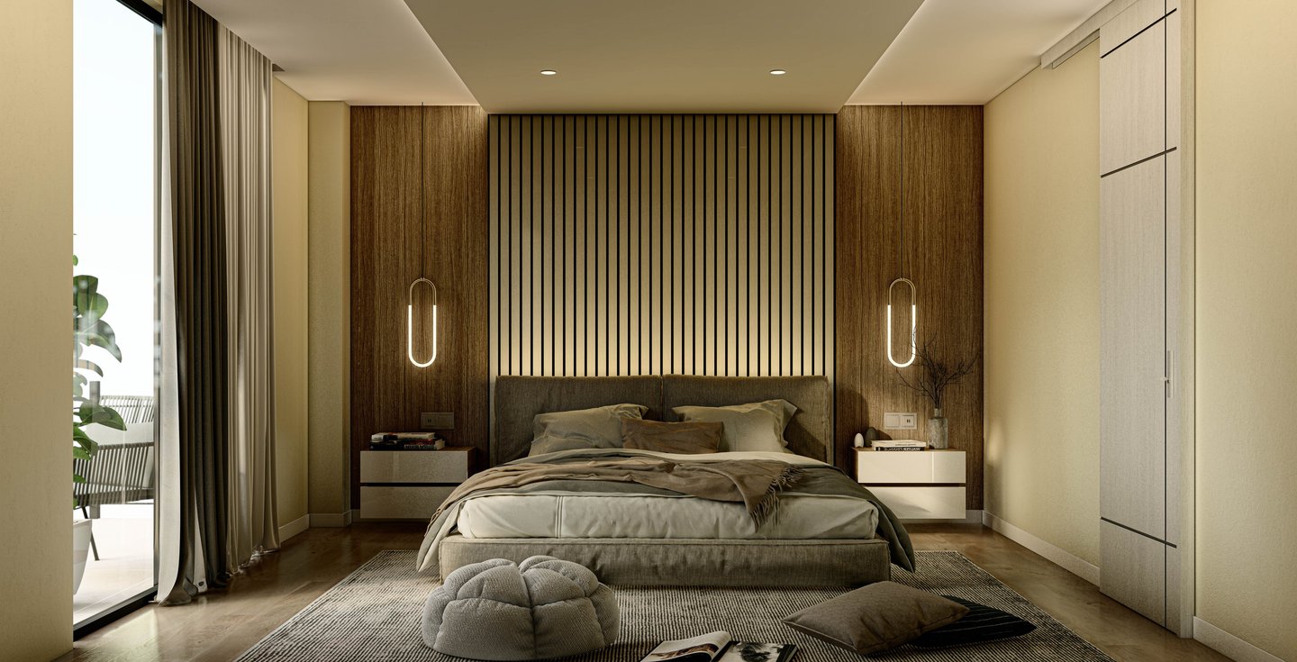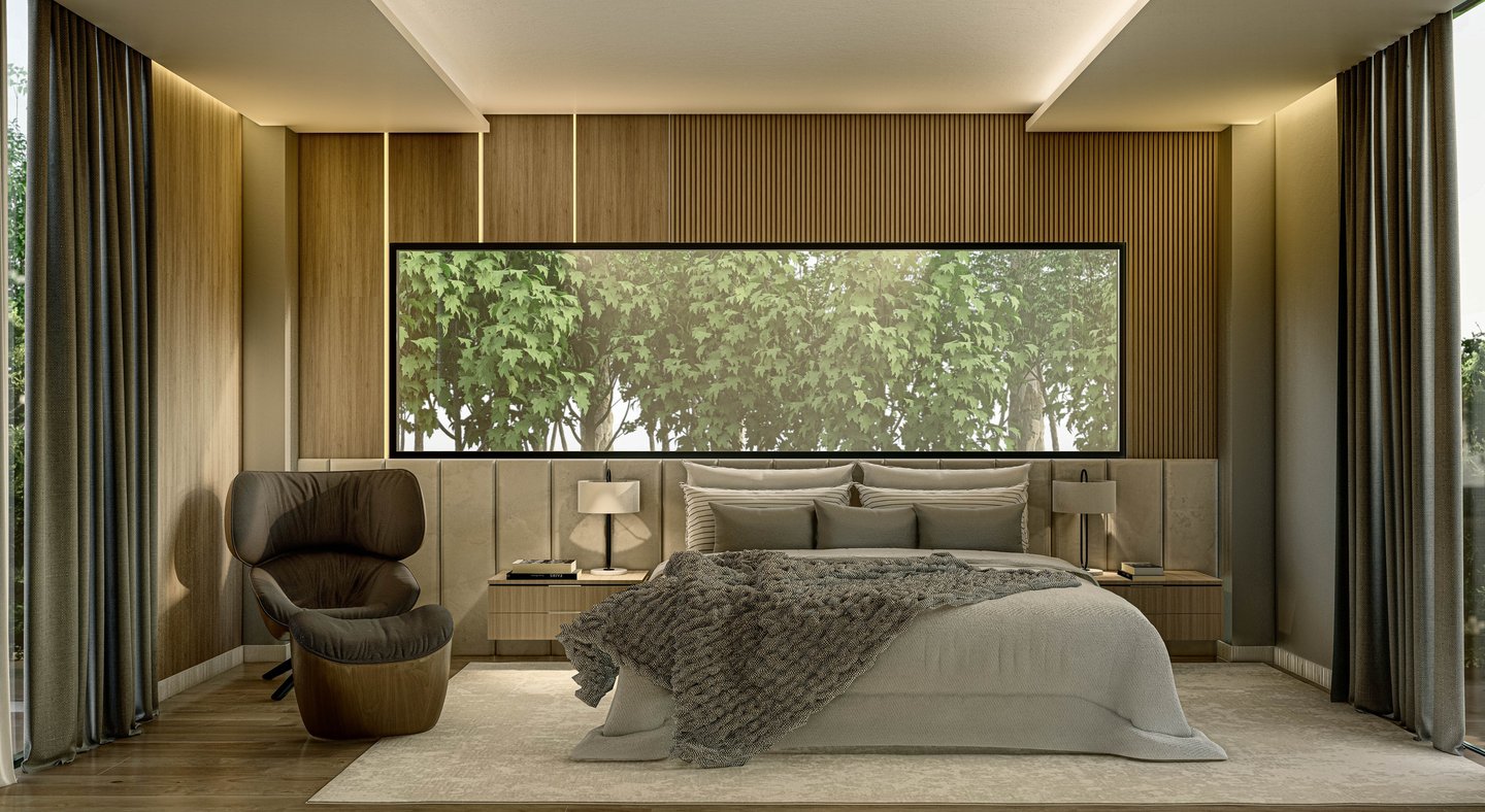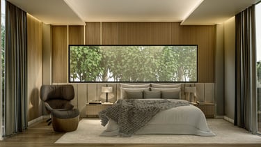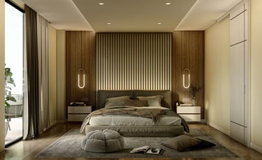 Un espacio acogedor y sofisticado, donde la madera y la iluminación indirecta se combinan para crear una atmósfera equilibrada. Con texturas de madera y luces estratégicamente ubicadas, buscando calidez y serenidad.
